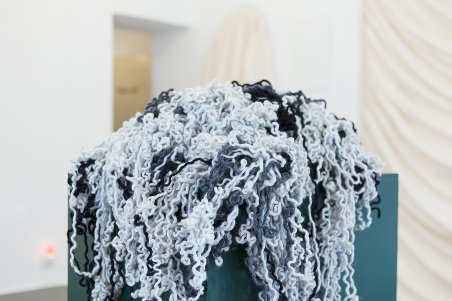 Dagmar Heppner recently worked with and around textiles or garments with attention to the unstable relations between objects, or between individuals and bigger structures. For her exhibition at Centrum, 'Stories', the artist has worked site-specifically focusing on the characteristics, the quirks, and oddities of the exhibition space. To that end, Dagmar Heppner has designed and sewn two ‘garments’ for both the larger and the smaller of the two bow-shaped pieces of fake wall sitting next to each other on one of the long walls protruding from it taking the form of textile sculptures. Presented on a plinth we find another of Heppner’s works, a bundle of loose woolen strands, formerly a piece of clothing, whose threads the artist has carefully untangled for the garment to be forever altered beyond recognition and repair.