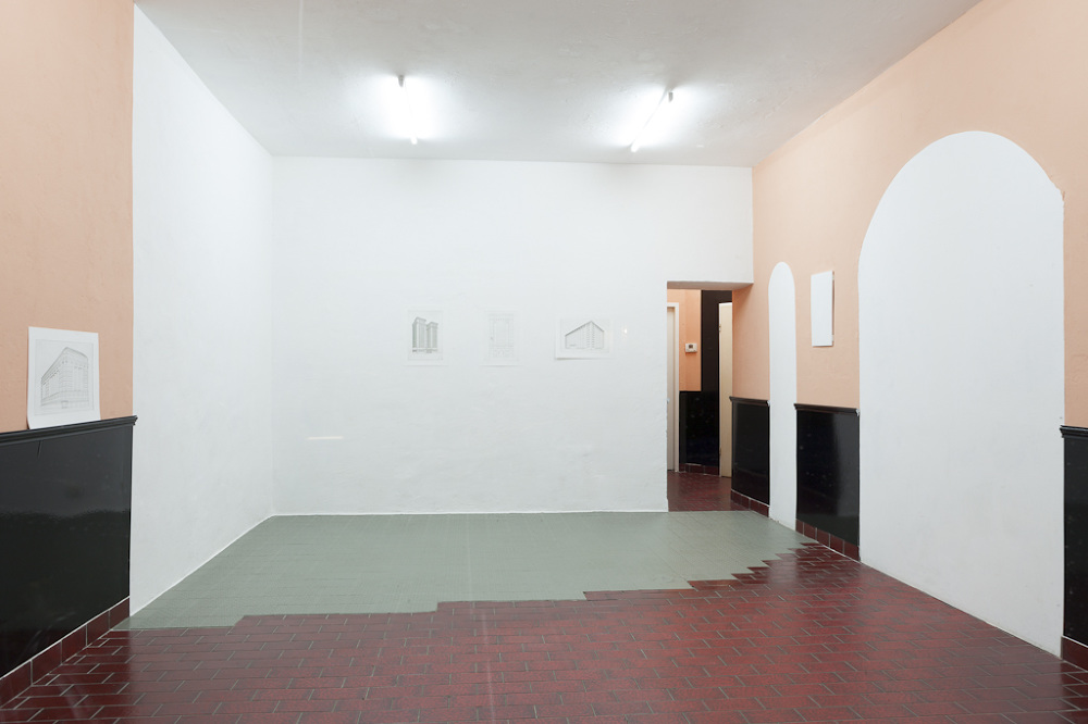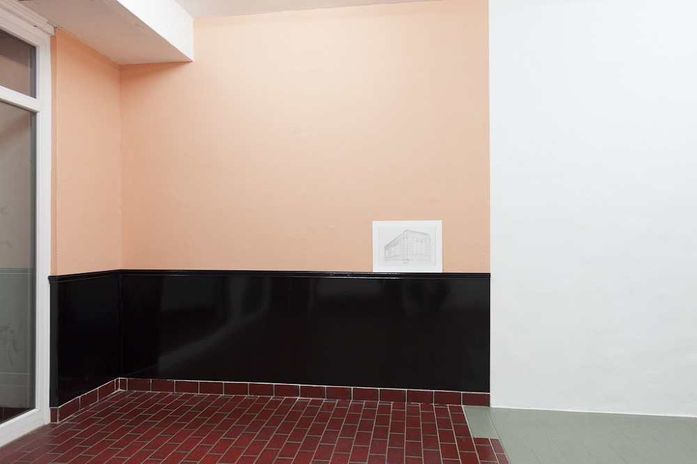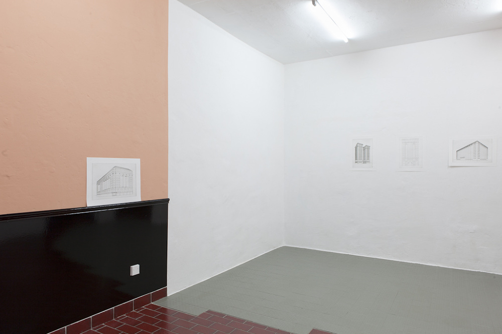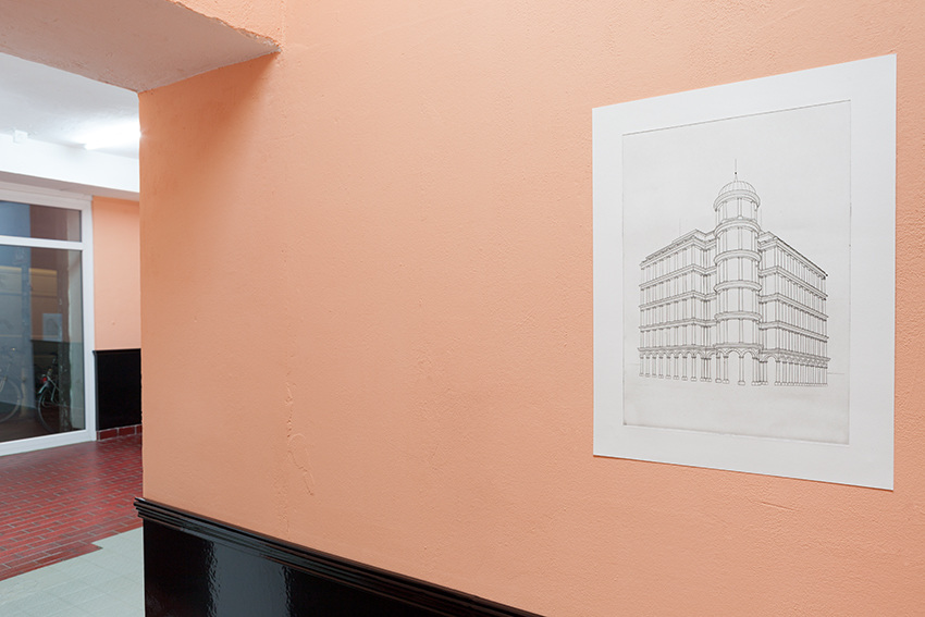 For her exhibition at Centrum Chloe Brooks has developed a site-specific work with several elements, with which the artist addresses the history of the architecture and the previous use of the project space and relates it to the history of the parlour. First used during medieval times, the term parlour (from French parler, to speak) was used to describe the parts of a monastery – often closest to the main entrance – which were used for communication and trade with the outside world. Later in the 18th and 19th centuries, the parlour or drawing room became the ‘window to the world’ within the private homes of the upper and middle classes, where visitors were received and where the family presented itself and their social status through the display of their best furniture, works of art, and other status symbols. The extravagance and aura connected with the historical meaning of the term is rendered ambivalent in the exhibition through a distinct use of material: the historicising architectural elements typical of a parlour are covered in black shiny vinyl and are set in contrast with peach-coloured walls, a direct reference to Centrum’s previous history, which before its transformation into an exhibition space served as the bar and anteroom of a brothel. Another important part of the installation is a series of four etchings, each depicting a building in 20th century American neoclassicism. A typical characteristic of this kind of architecture is archaising columns, which evoke the temples of ancient Greece, together with modern green glass curtains. The combination of a historicising vocabulary of architectural forms with modern building materials was chosen to transmit a certain image: symmetry and balance as a symbol for strength, longevity and wealth as well as progress and transparency. For the etchings, the artist first produced digital drawings of the buildings which were photo-etched onto a metal plate and hand-printed. Again, modern means meet with tradition: the preliminary drawing executed with digital technology is subsequently printed on paper using a printing technique which is outdated and nowadays rarely used. In a similar way as the installation in which they are presented, the etchings, and the buildings depicted in them, reference a historical pomposity, which is skewed and exaggerated through the distinct use of material and technology.
