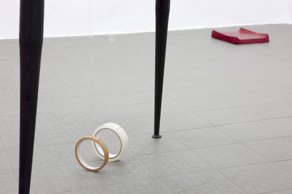 One of the new works created for her exhibition at Centrum has been inspired by a passage in John Berger’s Hold Everything Dear (2007), in which he describes how he lets a roll of tape that he had stuck to the edge of the table, fall to the floor and allows it to hang there. Patel, who has recreated the scenario in the exhibition space, describes her fascination with that image as being one of a 'precarious stillness'. A state of equilibrium is reached as the roll makes contact with the floor. Although it touches the floor lightly, it is enough to temporarily inhibit movement. The quietness of the tape is in contrast to the loud and swift movement that preceded it, which transforms its discreet form through a simple, single action.