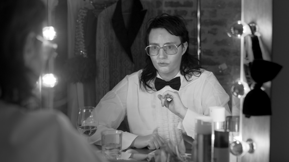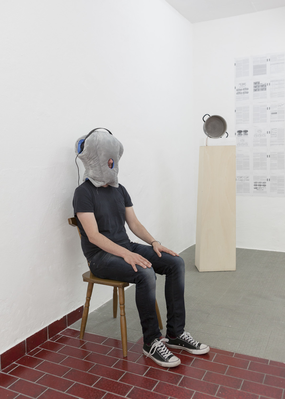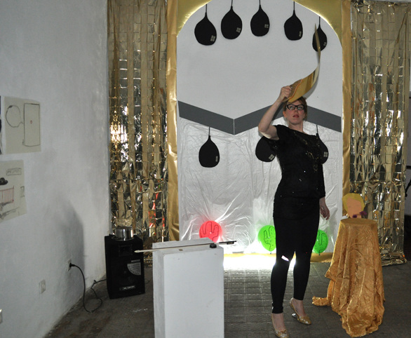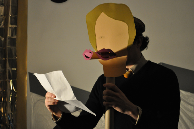 In Melanie-Jame Wolf's exhibition Sarcasm Expires Quickly at Centrum, the stage becomes the venue of a temporal and psychological entanglement of representation and performer. Where does performance begin, where does it end? And who does the social machinery of desire allow to entertain others? The dichotomous body, as seen by oneself and as seen by others, becomes a political enigma in this exhibition. The humor in Melanie-Jame Wolf's texts, performances, films, and installations is a strategy for subliminally posing this riddle.