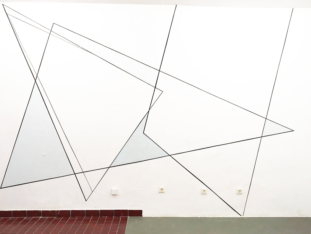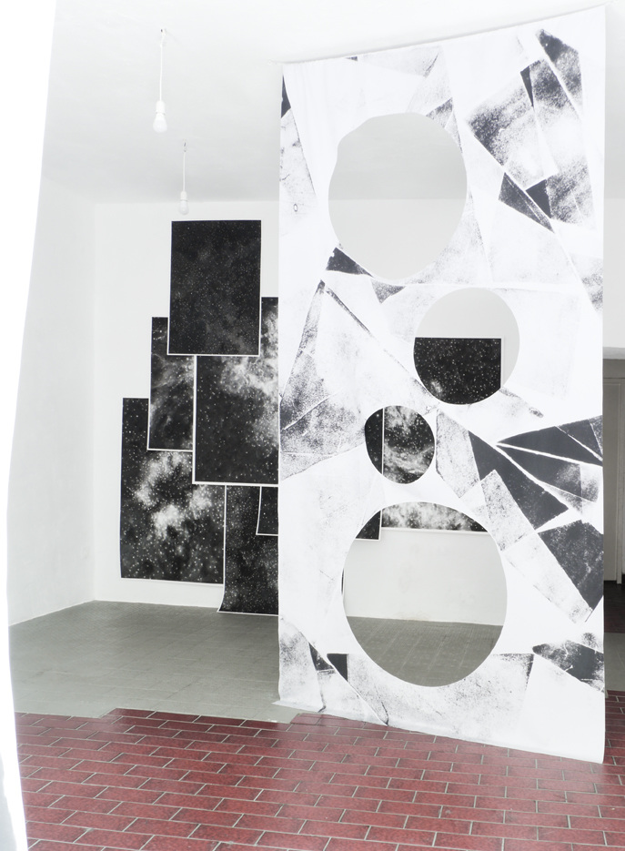 For his exhibition Constellations Sebastian Bartel, who holds this year’s Schloss Ringenberg scholarship, will develop a site-specific installation for Centrum’s window, which will include some of his most recent works in painting and drawing. The main element is the translucent curtain with crystalline structures and circle-shaped cut outs which descends upon the works like a scenery. Again and again it allows insights at the drawings and paintings and in this context plays with the perception of close and distant similar to a lens. Besides geometrical forms celestial bodies come up as if the viewer could explore a new cosmos through a telescope.