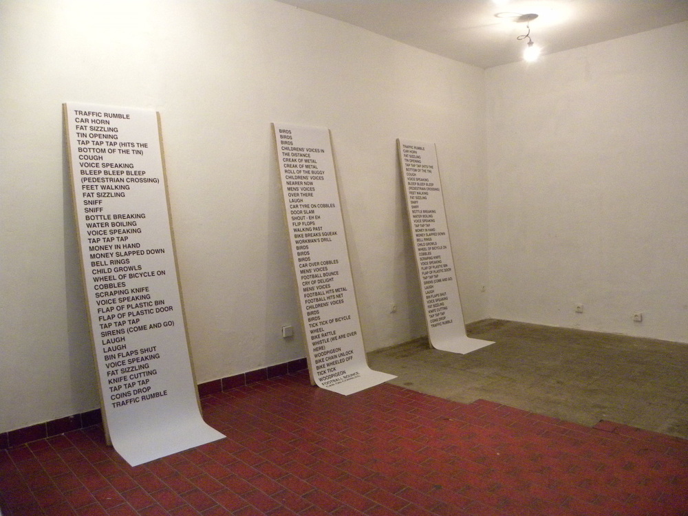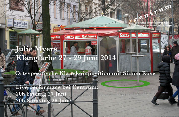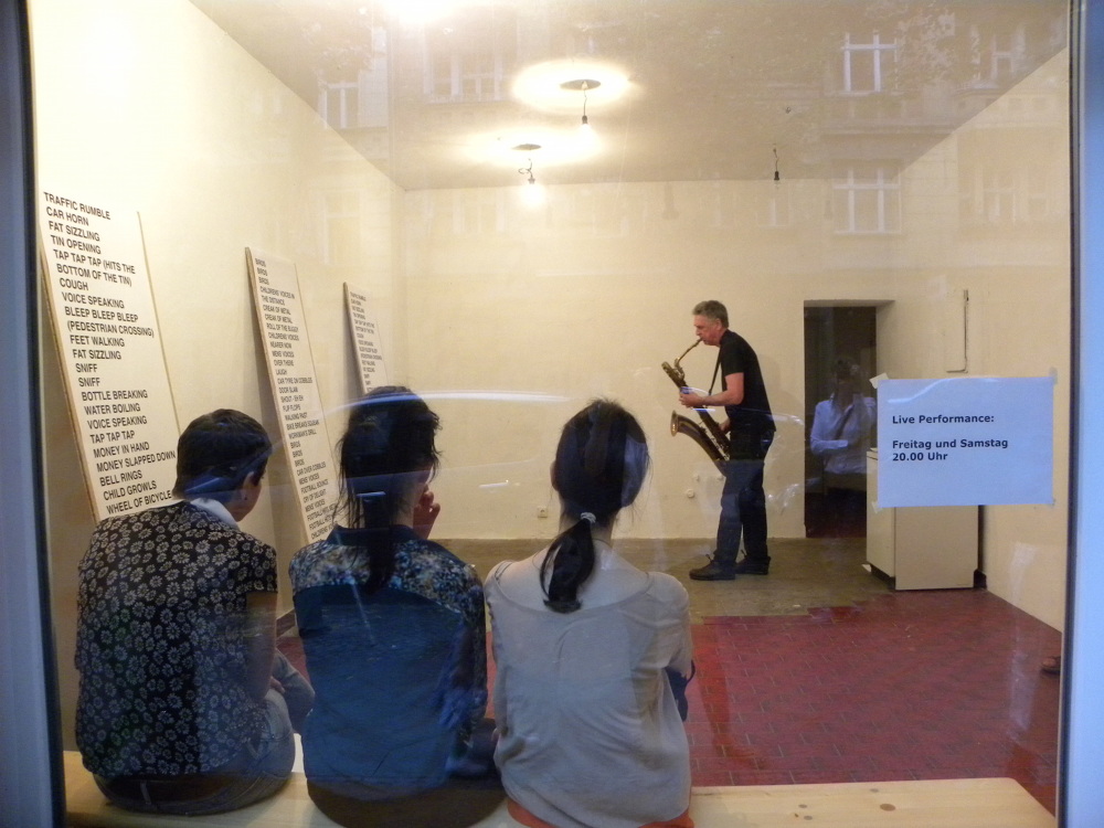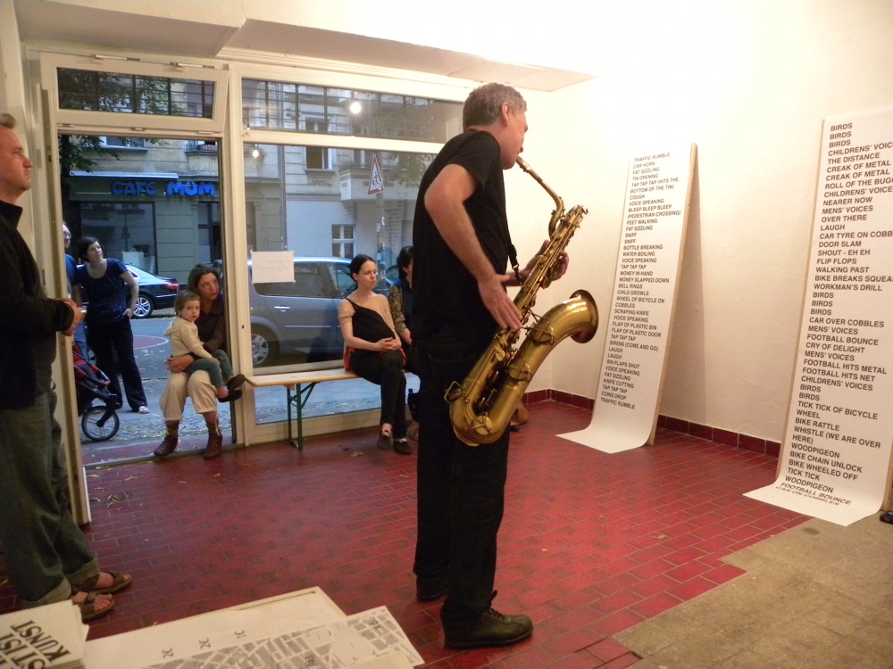 For her site specific compositions for three corners in Neukölln Julie Myers adopts the role of a stranger or outsider in order to initiate a response, or make sense of a specific place. She finds a place to sit and to watch, to get to know her environment. She hears the ‘sizzle’ of food being made, the timbre of a voice, the cry of a child, the hum of the traffic. Her texts, like graphic scores, are presented in the gallery for interpretation by improvisor Simon Rose on baritone saxophone.